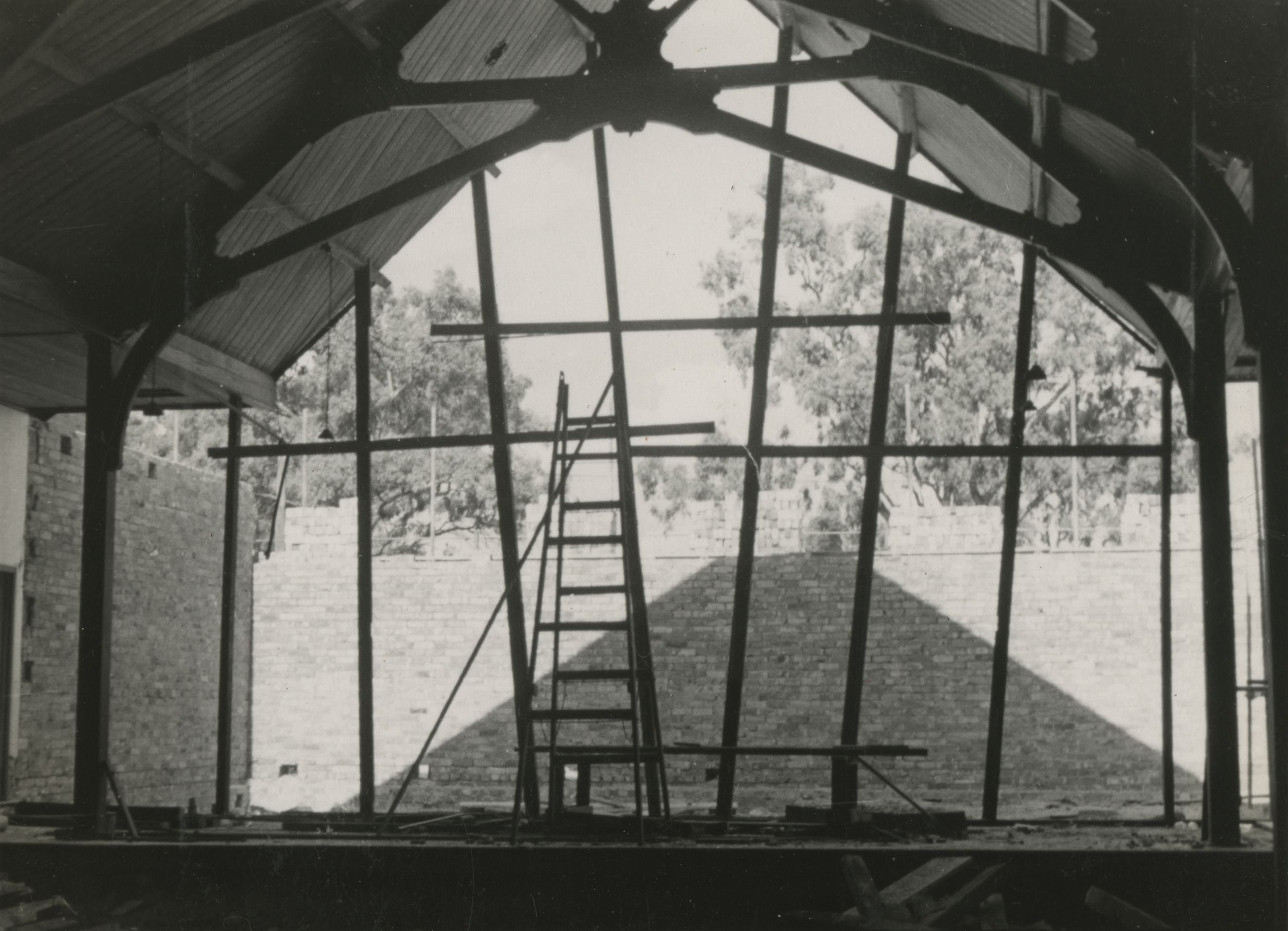 The eastern end of the Hall being extended during the summer break of 1954.