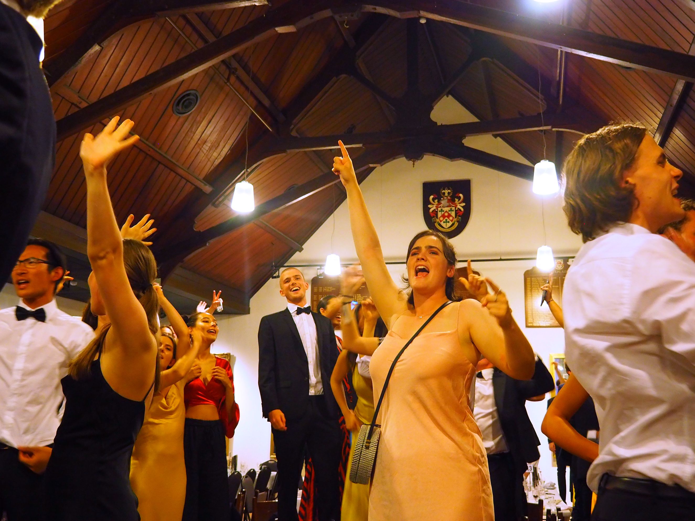 Arms raised in celebration, students mark Commencement Dinner in the Dining Hall, February 2020.